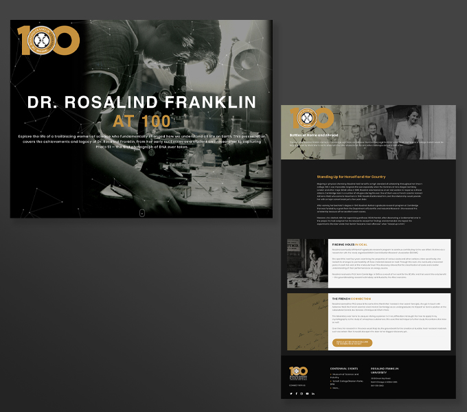 To celebrate Dr. Franklin's centennial (100th Birthday – July 25, 2020) we designed a centennial logo and stand-alone website that features her historic achievements and the enduring legacy from scientific discovery through the establishment of the university. This site serves as an “online museum” of Dr. Franklin’s life.